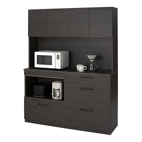 LOWYAの食器棚は、幅140cmでグレーの洗練されたデザイン。半完成品で組立簡単、引き出し付きで収納力抜群。日本製の高品質なキッチンボードです。