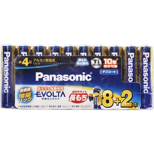 パナソニックのエボルタアルカリ乾電池単4形10本パック。長持ち性能で、リモコンやおもちゃなど様々な機器に対応。安心の耐漏液設計で、効率的なエネルギー供給が特徴です。