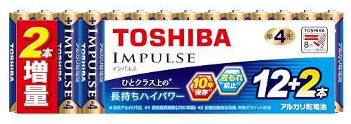 東芝のアルカリ乾電池単4形は14本入り(12本+2本増量)で、1.5Vの出力です。使用推奨期限は10年で、液漏れ防止構造を採用したIMPULSE LR03H 12MP 2Zモデルです。