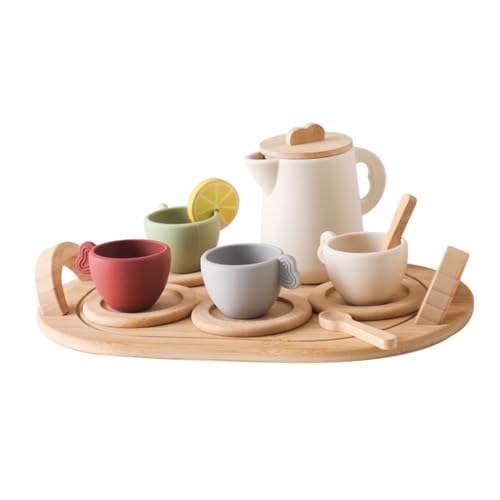 LIOOBOの木製とシリコン素材のミニチュア茶器セットは、視覚と触覚を育むおままごと用のティーポットセットです。子どもたちのアフタヌーンティーごっこ遊びに最適です。