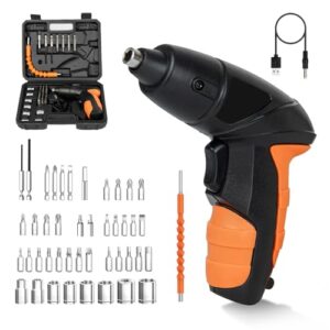 WEIDUOYIの小型電動ドライバーは、女性や初心者向けの49個部品付き。4.2V、3.5N.m正逆転切替、変形ハンドル、USB充電、LEDライト付き。収納ケース入りで軽量、DIYや家庭用に最適。