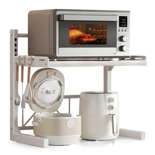 BLACK BADGERのレンジラックは、2段式で幅が41~60cmに調整可能。棚板の高さも変更でき、耐荷重は30kg。カーボンスチール製で、サイズはD33*H58*W40.5~59.5cm、カラーはホワイト。
