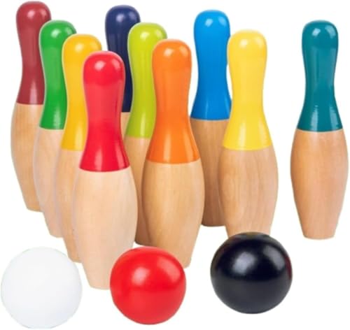 子ども向け木製ボウリングセット。10本のピンと3個のボールが含まれ、アクション・スポーツトイとして楽しめる。ボーリングやスキットルゲームに最適なアイテムです。