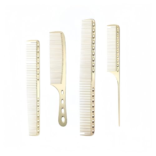 アルミ製のヘアコームセット(4本組)は、軽量で耐久性に優れた金属製。髪の長さやタイプに合わせて使用可能な明るい銀色のコームで、サロン、理髪店、ホームケアに最適です。