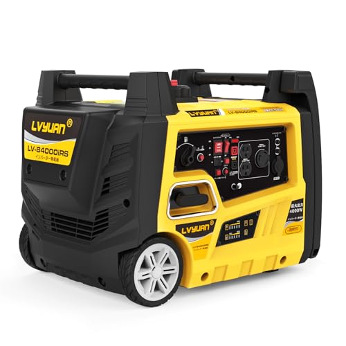 リョクエン(LVYUAN)インバーター発電機 B4000iRSは、最大出力4kVA、定格出力3.5kVAの純正弦波ガソリン発電機です。電気始動・リモート始動対応、高出力、防音設計、キャスター付きで便利です。50Hz/60Hz切替、過負荷保護、オイル不足警告、省エネモード搭載。