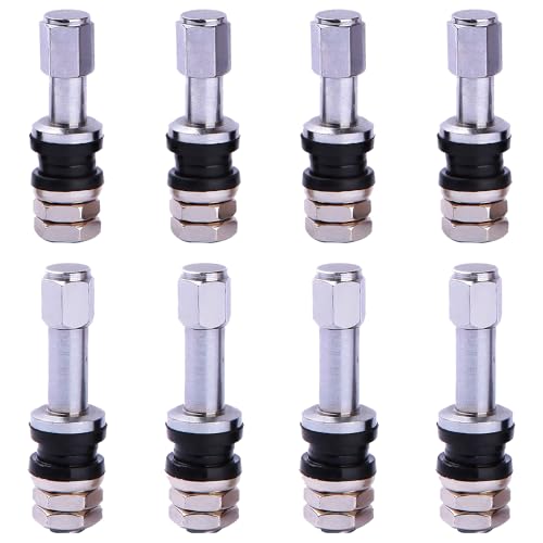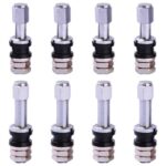 タイヤバルブの8個セット。金属製のバルブステムで、チューブレスタイヤに適したエアバルブ。TR43Eタイプ4本とTR48Eタイプ4本を含み、耐久性のあるアルミ製。