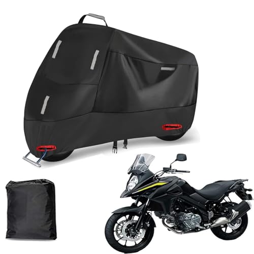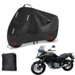 スズキ Vストローム650 ABS専用の300D全天候型バイクカバー。防水・防埃・耐熱機能を備え、盗難防止・紫外線対策も万全。5つの反射ストリップとワンタッチバックル、前後にアイレット付きで便利です。