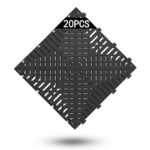 ガレージタイル20枚入り、サイズ40×40×3cm。ポリプロピレン製で耐荷重・耐久性に優れ、滑り止め機能付き。自動車・バイク用の駐車場や整備工場、洗車やガーデンにも最適。屋外でも使用可能で、取り付けも簡単。カラーはブラック。