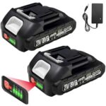 UPF製のマキタ互換バッテリー18V/21V 2000mAhの2個セット。長時間作業可能で、LED残量表示、保護機能搭載。小型軽量、充電器付きでPSE認証済み。