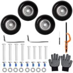 4個セットのスーツケースタイヤ交換キット。旅行用トロリーケースやキャリーバッグの車輪をDIYで修理可能。直径50mmのブラックのキャスターが含まれ、ノコギリも付属しています。