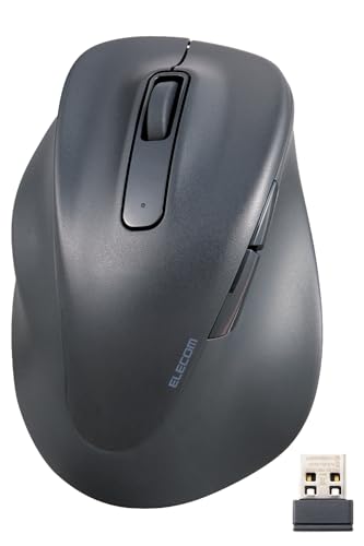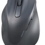 エレコムの2023年モデルのワイヤレスマウス、静音設計で左手用のLサイズ、5ボタン搭載。抗菌処理済み、AskDoctors評価認証取得のブラックモデル。