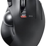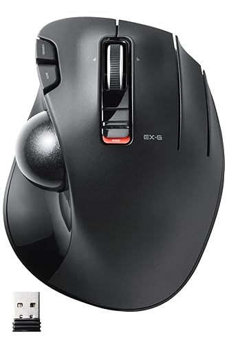 エレコム ワイヤレス トラックボールマウス EX-Gは、握りやすさを追求したデザインで、6つのボタンとチルトホイールを搭載。左右スクロールが可能で、快適な操作性を提供します。ブラックのシックな外観です。