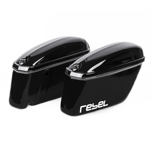 レブル250/500用の鍵付きサイドボックス2個セット。ハードケースで耐久性があり、工具箱としても便利。専用ステー付きで簡単取り付け可能。ブラックカラーのシンプルなデザイン。