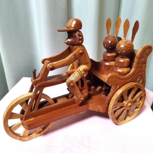 からくり工芸細工の木製人形、猿とウサギが可愛らしい乗り物に乗っています。専用箱付きで、ディスプレイやギフトにも最適。伝統技術を活かした精緻な作りが魅力的です。