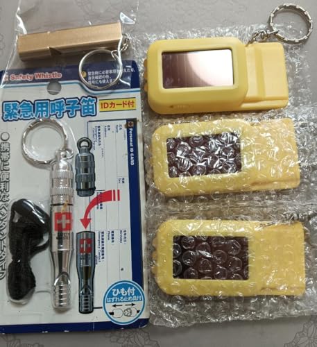 緊急用呼子笛とソーラーライトホイッスルを含む防災防犯用5点セット。屋外活動や災害時の緊急連絡に最適。高い視認性と音量で安心サポート。