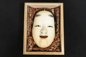 t7L110 面打師 梅木草屯 小面 能面 在銘 刻印 共箱 面袋付 若女 在銘 彫刻 伝統工芸品 飾り 彫刻 骨董 民芸 和風 古道具 能楽