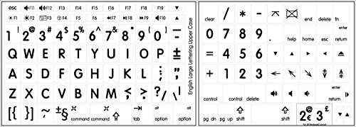 Mac用の大型英語レタリングキーボードステッカーです。ラミネート加工で耐久性があり、非透明なホワイトデザインが特徴。視認性が高く、タイピングを快適にサポートします。