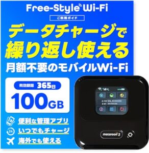 新モデルのポケットWiFi、USB型の365チャージWiFi。バッテリーレスで100GBのデータ使用が可能。簡単設定でプリペイド式、月額費用なし。特に車載利用に最適。