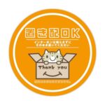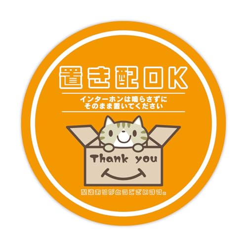 置き配OKの猫イラストステッカー。マグネットタイプでインターホン不要、ポストプレートとして再配達防止対策に最適。感謝メッセージ付き。サイズは95mm×95mmで、オレンジカラー。