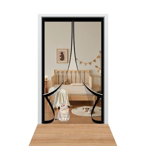 玄関用マグネット式網戸、サイズ74x176cm。収納バックル付きでペットにも対応。下部に重りが入っており、虫よけや換気に最適。リビングやベランダ、店舗用としても使用可能。色はブラック。