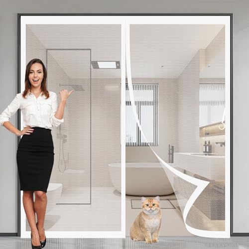 この玄関用網戸は、センター開きのデザインでサイズは82 x 215 cm。自動で閉まり、設置が簡単。超細密目で通気性があり、防塵・防虫効果も備えています。アパートやドアに最適なホワイトカラーです。