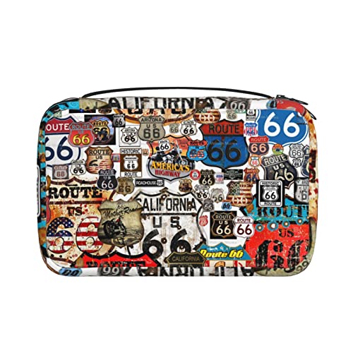 アメリカの66号道路デザインの洗面用具ポーチ。コスメや旅行用品の整理に最適。防水・超軽量で、多機能持ち手付き。旅行や出張、ジム、アウトドアに便利な収納袋です。