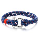 メンズ・レディース用のスチールスクリューアンカーシャックル付きブレスレット。ノーティカルブルー、ホワイト、レッドのコットンロープを使用し、長さ7.87インチ。宝石なしのシンプルデザイン。