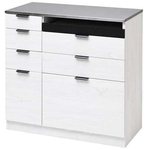 moca company Stela ステンレス天板キッチンカウンターは、幅90cm、奥行45cmのロータイプで、引き出し付き。食器棚やカップボードとして利用でき、ホワイトの美しいデザインが特徴です。