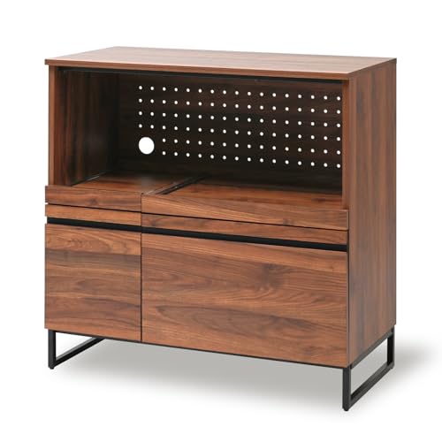 Cloudearのキッチンカウンターは幅90cm、奥行45cmで大型レンジに対応。ダブルスライドレンジ台として、家電収納に便利なコンセント付き。スライド棚も装備し、ブラウンのデザインが魅力です。