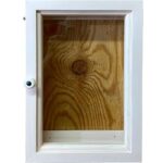 ひのきの木製インターホンカバーです。透明ガラスで中が見える仕様。ホワイトステイン仕上げで、サイズは20×6×30cm。オーダーメイド・ハンドメイドで、洗練されたデザインと温もりを提供します。