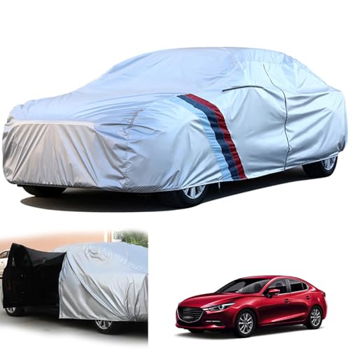 マツダアクセラ セダン/スポーツ BM系 BY系用の車カバー。耐水圧オックスフォード生地、蛍光反射ストリップ付き。防水、防塵、防雪、紫外線防止、スクラッチ・引裂き耐性あり。全天候型保護の銀色カバー。