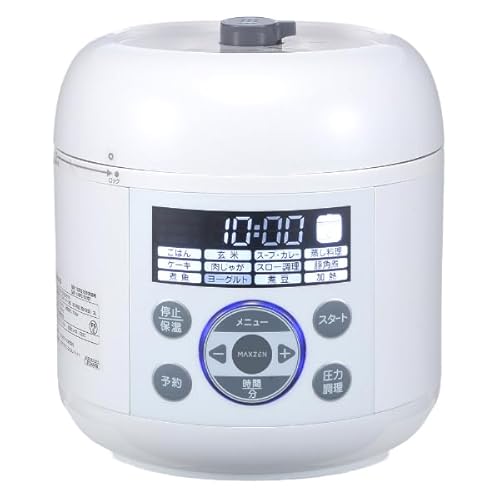 MAXZENの電気圧力鍋1.3Lは、炊飯、蒸し料理、ヨーグルト、ケーキなど多機能。簡単操作で時短調理が可能。コンパクトでおしゃれなホワイトデザイン。レシピブック付き。