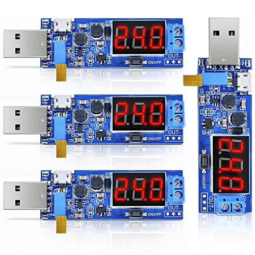 MdskGangのUSB DC-DC昇降圧コンバータは5Vから1.2V~24Vに調整可能。昇圧・ステップダウン機能を備え、LCDディスプレイ付きで車や充電器に適用。4個入り。