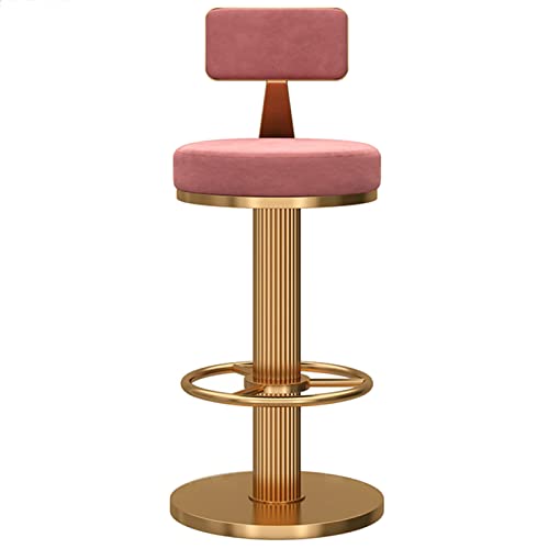 回転スツールは、背もたれ付きのバーチェアで、ベルベット生地のシートとゴールドフレームが特徴です。調節可能な高さ(65-80cm)で、キッチンやレセプションに最適。色はピンク。