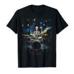 ドラムキットとパーカッショニストを愛するドラマー必見のTシャツ!スケルトンデザインでユニークなドラム演奏スタイルを表現。高品質素材使用で快適な着心地。音楽ファンにぴったりのアイテムです。