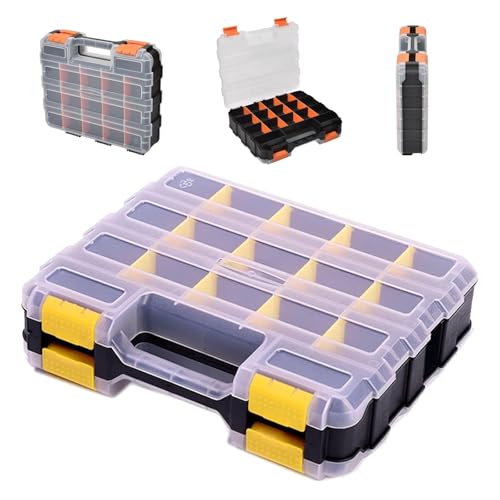 34コンパートメントツールボックスは、多数の収納スペースを持ち、工具や小物を整理しやすく設計されています。耐久性が高く、持ち運びに便利な取っ手付きで、DIYやプロの作業に最適です。