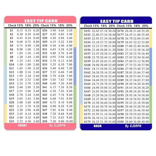 現金用チップカードは、2枚組のスリムサイズで、15%、18%、20%のチップ計算が簡単にできます。レストランやホテル、配達サービスでのスタッフ向けに最適です。