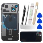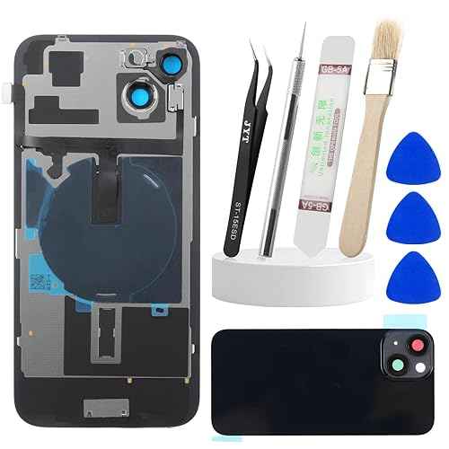 SRJTEKのiPhone 14 Plus用バックガラス交換キット。リアカバー、メタルプレート、マグネット、カメラレンズ、ワイヤレス充電コイル、フレックスケーブル、マイクホルダーがすべて揃っており、旧デバイスからの移植は不要です。対応モデル: A2886, A2632, A2885, A2888, A2887。色: ミッドナイト(ブラック)。