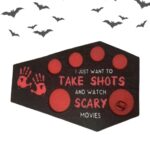 ハロウィン向けのホラーショットトレイ。木製サービングボードで、ショットグラスをサーブするのに最適。パーティーやバー、レストランで雰囲気を盛り上げるアイテムです。