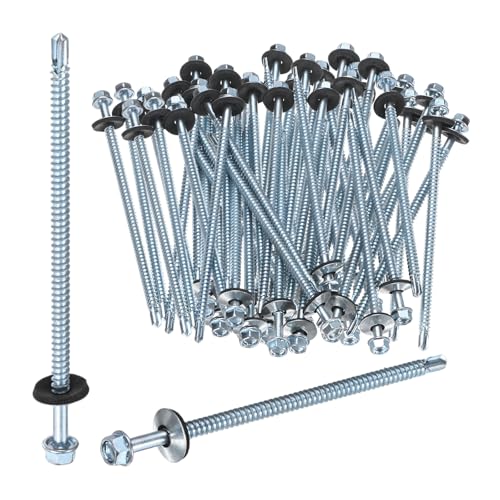 M METERXITYのセルフドリルねじは、50個パックの#12 x 5で、長さ125mmです。亜鉛メッキされた炭素鋼製で、金属屋根やサイディングパネル、スチール構造に最適です。ゴムワッシャー付き。