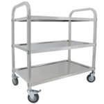 ステンレス製の3段組立式配膳カート。耐荷重約150kg、ホイール付きで移動も楽々。ホテルやレストラン、医療用に最適。サイズ75x40x83cm。