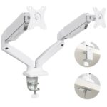 PCモニターアームは、13~30インチのデュアルモニターに対応し、耐荷重は2~9kgです。ガススプリング式で多角度調節が可能。グロメット式とクランプ式の取り付け方法を選べ、VESA100*100に対応。ケーブル収納機能付き。