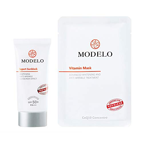MODELO化粧品のセットには、SPF50+ PA+++の日焼け止め(50ml)とプレミアムビタミンマスク(25ml)が含まれています。高いUVカット効果で肌を守り、ビタミン補給で美肌を促進します。