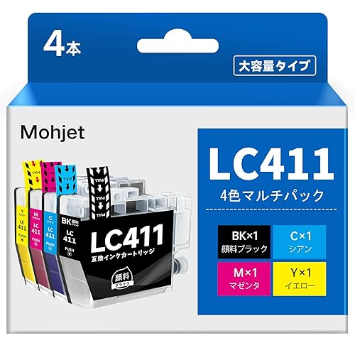 Mohjet LC411-4PKは、ブラザー対応の4色6本セットです。互換インクで、DCP-J526NやMFC-J739Dなどに使用可能。純正インクと併用可。高品質な顔料インク LC411BK含む。