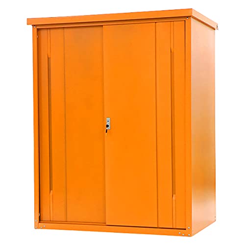 屋外物置スチール製、家庭用収納庫。鍵付きで幅約1240mm、奥行約810mm、高さ約1550mm。UVカット機能付き。可動棚や吊戸があり、ガーデンやガレージに最適な収納庫。