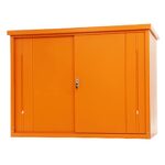 屋外物置は幅約1540mm、奥行810mm、高さ1150mmのスチール製収納庫です。鍵付きでセキュリティも安心。UVカットで耐候性に優れ、可動棚や吊り戸付きで使い勝手も良好。ガレージや庭の収納に最適。