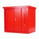 屋外物置 スチール製の家庭用収納庫です。サイズは幅約935mm、奥行約650mm、高さ約850mm。鍵付きで安全、UVカット機能付き。可動棚や吊り扉があり、庭やガレージに最適です。カラーはレッド。