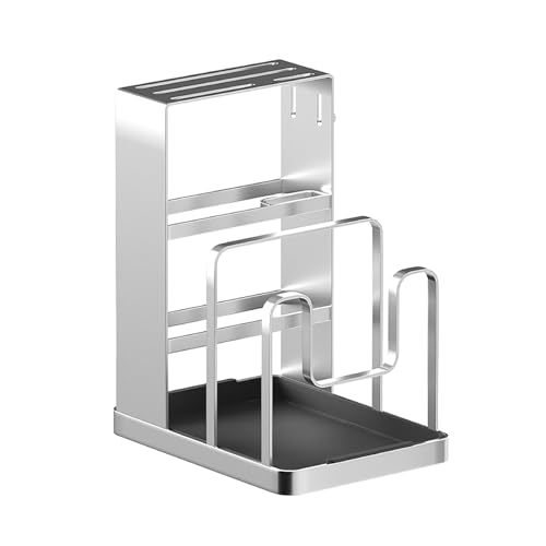 まな板・包丁スタンドはステンレス製で水受け付き。包丁やまな板、鍋蓋をスマートに収納できるキッチン収納アイテム。新生活にも最適な便利な道具です。