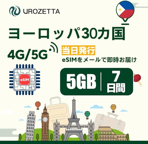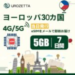ヨーロッパeSIM 7日間5GB、32カ国対応(フランス・イタリア・スペイン・ドイツ・スイス・イギリス他)。当日発行、QRコード即送付。4G LTE高速通信、ホットスポット利用可、データ通信専用。
