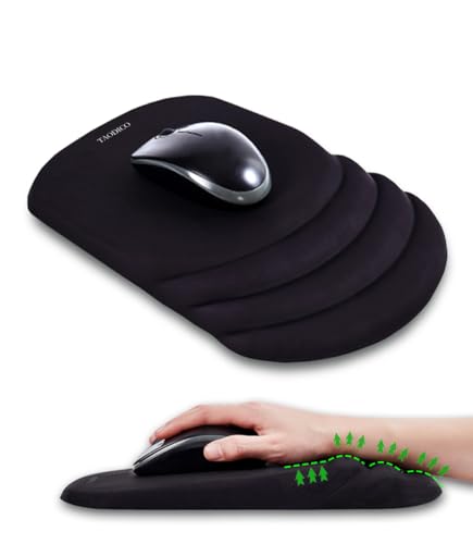 TAODICO人間工学マウスパッドはリストレスト付きで、ミルクシルク生地と丈夫なシリコン充填が特長。滑り止めポリウレタンベース、マッサージデザインで痛みを緩和し、ワイヤレスマウスとデスクに最適です。サイズは30.5×20.34cm、カラーはブラック。